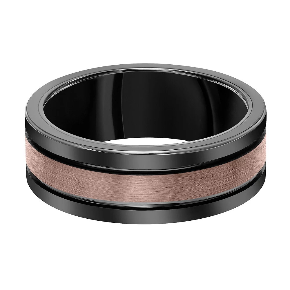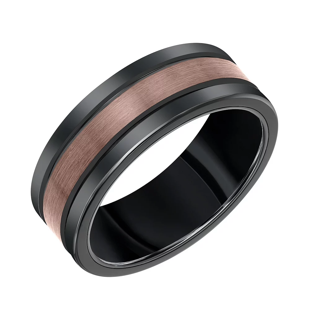 This AXL black and brown tungsten men’s wedding band features a timeless design.