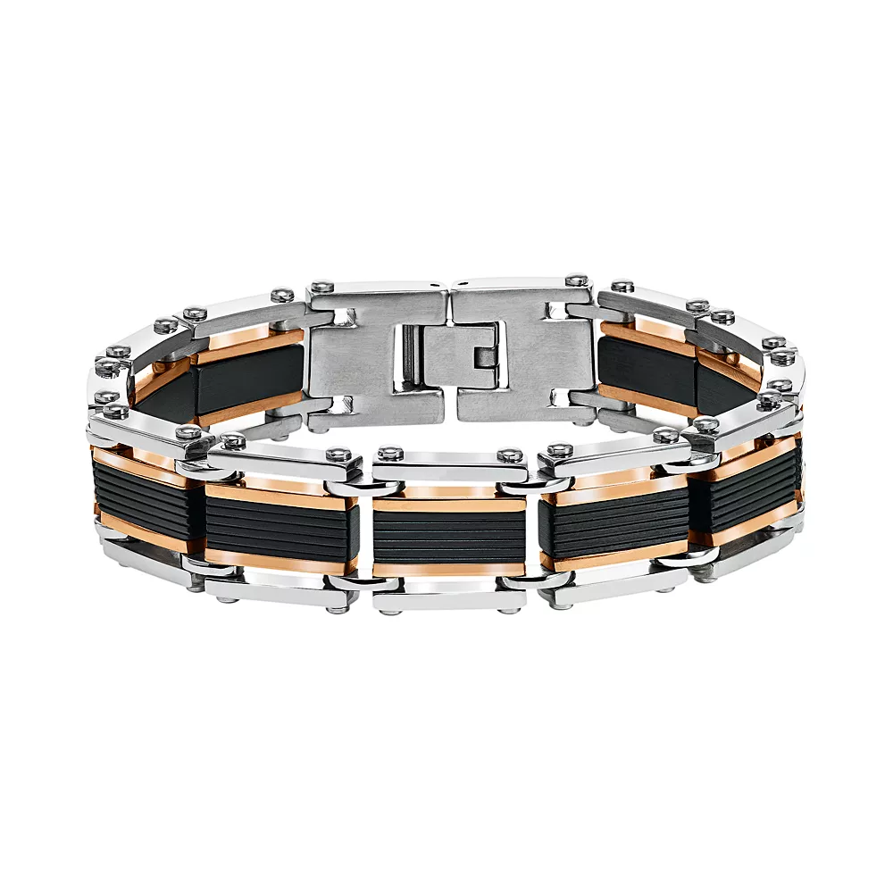 Featuring grooved links and a tri-tone stainless steel construction, this men’s bracelet is sure to make a handsome impression.