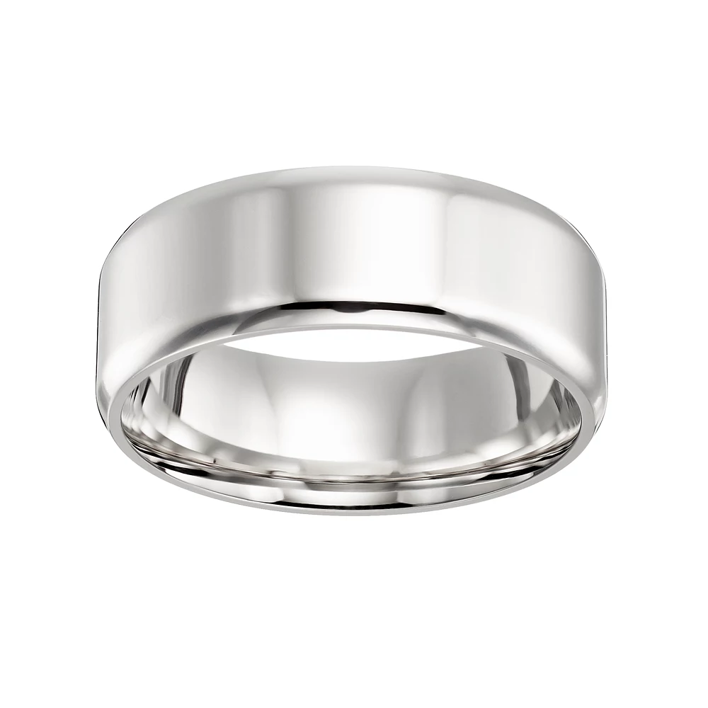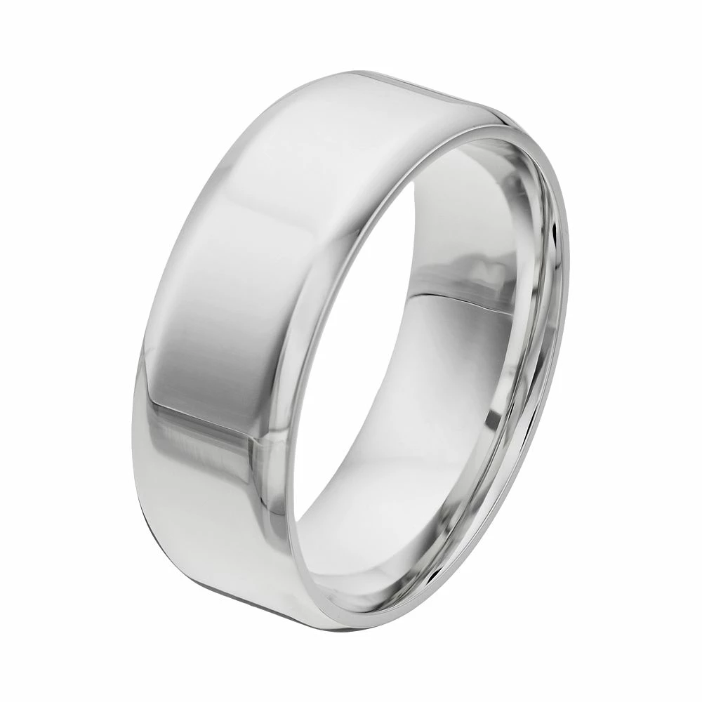 Celebrate a lifetime of love with AXL. Featuring rhodium plating and beveled edges, this stainless steel band is a stunning choice. Wear this timeless band with any ensemble.