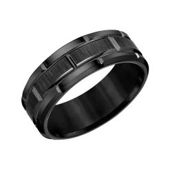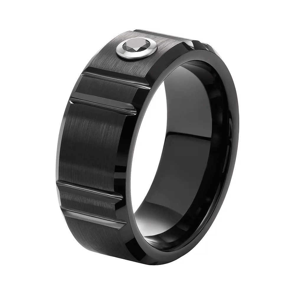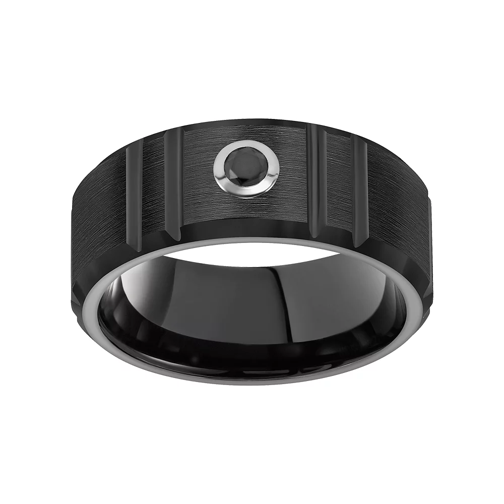 Featuring a bold design with black tungsten carbide and a black round-cut diamond, this wedding band offers a modern way to showcase your devotion.