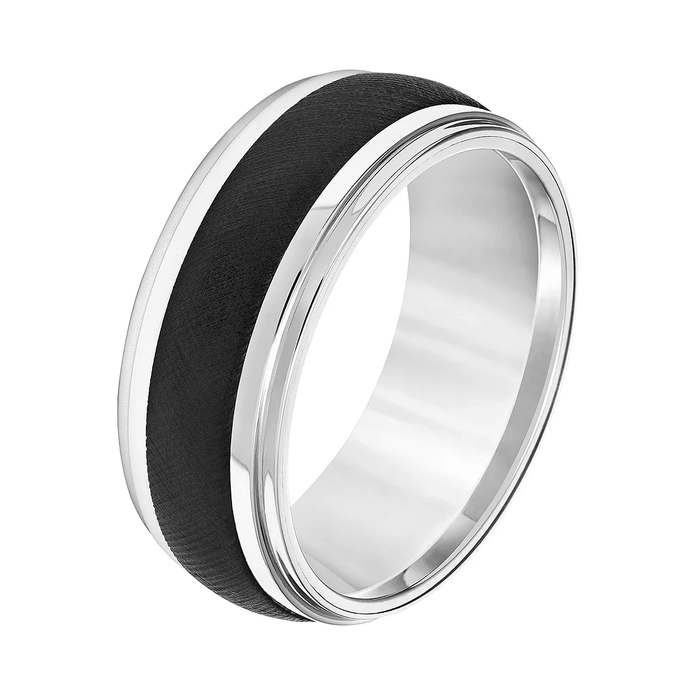 Featuring a bold design with black and white tungsten carbide, this domed men’s wedding band offers a modern way to showcase your devotion.