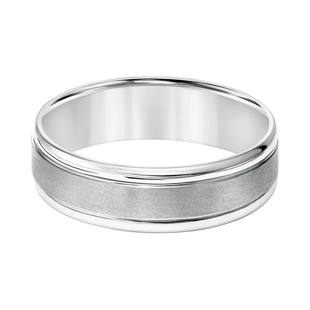 Crafted from 14k white gold, and featuring a brushed center stripe, this men’s AXL wedding ring offers timeless style.