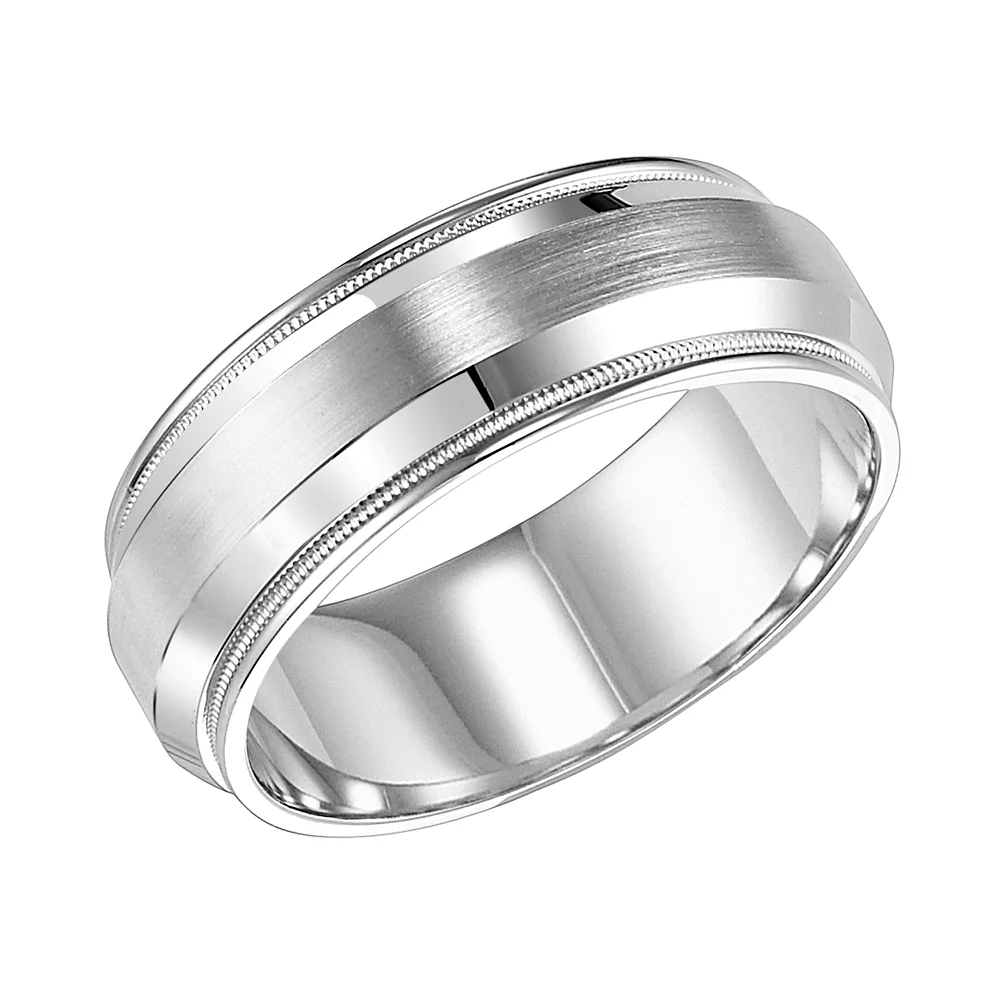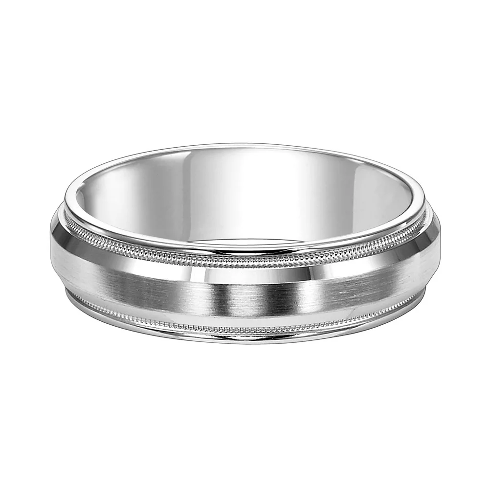Decorated with a brushed finish, milgrain details, and round edges, this men’s AXL 14k white gold wedding ring is sure to impress.