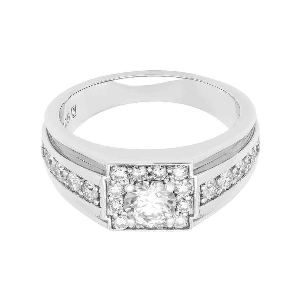 Decorated with round lab-created moissanite, this men’s halo ring provides a distinctive look that is sure to impress.