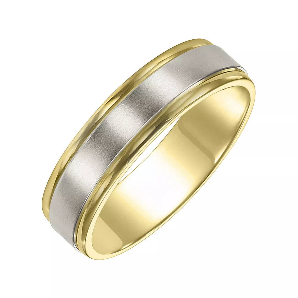Crafted from 14k gold, and featuring a satin-finished 14k white gold inlay, this two-tone men’s AXL wedding ring is an elegant symbol of your commitment.