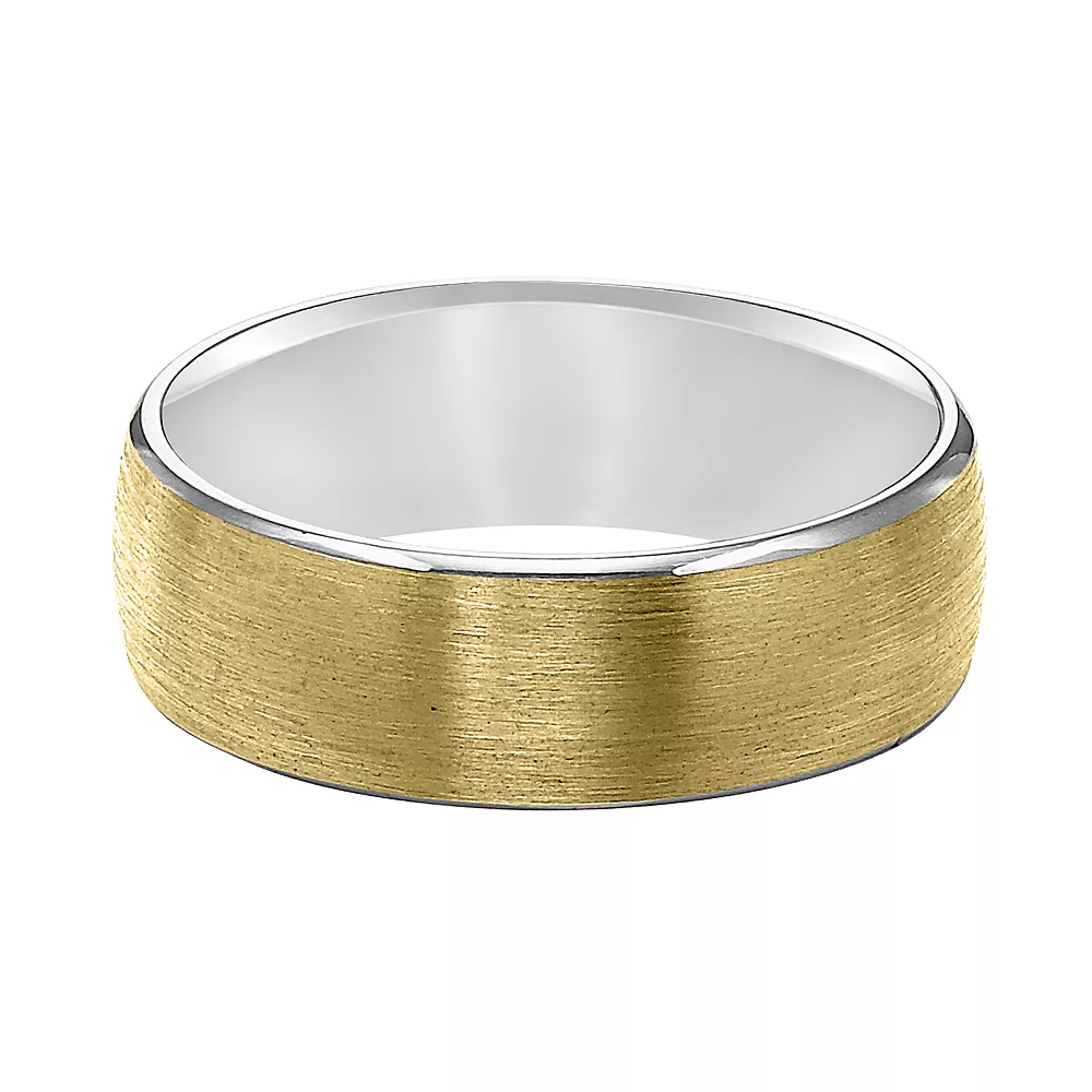 A satin finish and rolled edges give this two-tone 14k gold wedding ring a unique look you’ll love.