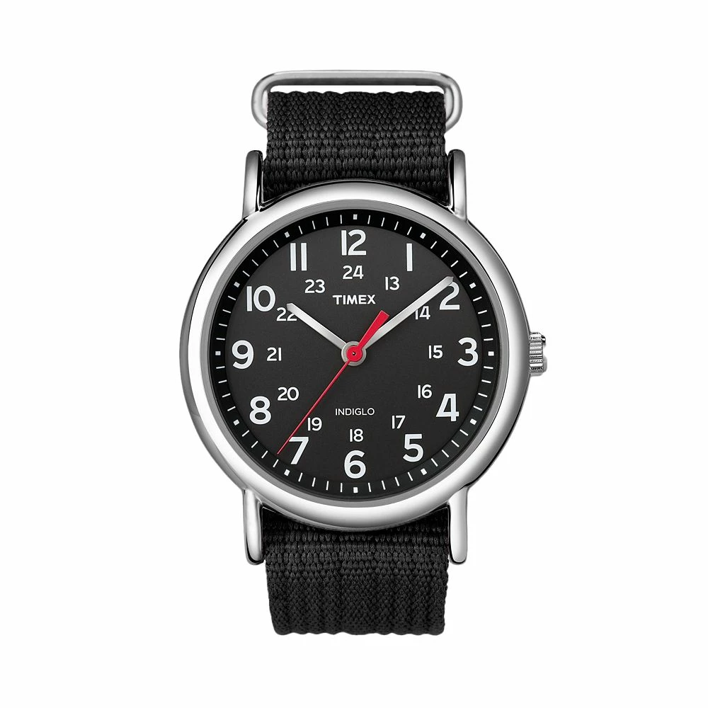 Smart and stylish. This Timex watch is a solid choice. Featuring a silver-tone case and black nylon band, this watch pairs perfectly with all of your casual outfits.